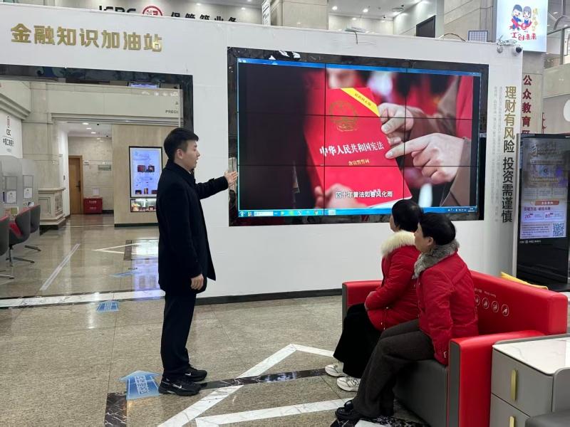 该行充分发挥营业网点服务窗口优势,精心打造沉浸式宪法宣传阵地。营业厅内,LED屏滚动播放宪法知识要点;等候区及金融知识宣教区摆放通俗易懂的宪法宣传折页和“金融法治知识小贴士”漫画,内容涵盖宪法核心条款、防范电信诈骗、金融消费者权益保护、反洗钱等与群众日常生活紧密相关的领域。该行工作人员利用客户等候间隙,主动开展“90秒普法微宣讲”,结合业务场景讲解账户安全、个人信息保护等法律常识,使网点成为普及法治理念的“固定课堂”。